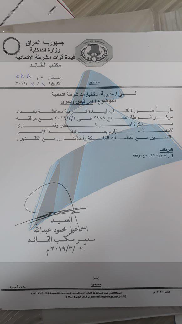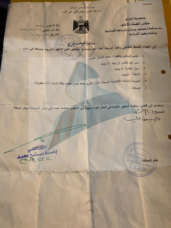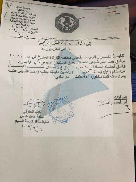 كشفت وثائق نشرتها مواقع خبرية يوم الإثنين صادرة عن وزارة الداخلية تتضمن مذكرة القاء القبض على حميد فرحان هايس (حميد الهايس) وفق احكام المادة (459).
