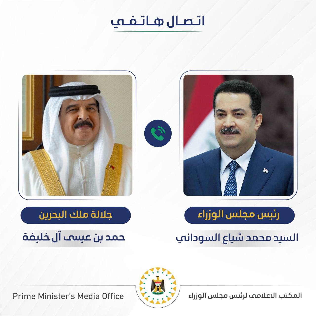 وذكر المكتب الإعلامي لرئيس مجلس الوزراء، أن "السوداني أجرى إتصالاً هاتفياً مع جلالة ملك البحرين حمد بن عيسى آل خليفة، هنأه خلاله بمناسبة احتفال مملكة البحرين بعيدها الوطني".