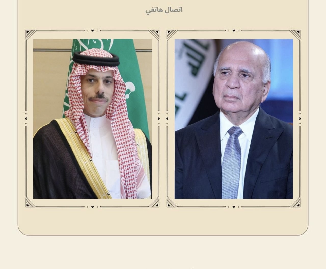 وذكرت الوزارة في بيان تلقاه كلمة الإخباري، أن "نائب رئيس مجلس الوزراء ووزير الخارجية، فؤاد حسين، أجرى اتصالًا هاتفياً مع سمو الأمير فيصل بن فرحان آل سعود، وزير خارجية المملكة العربية السعودية".